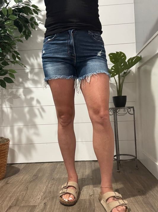 Everly Frayed Hem High Rise Shorts - dark wash