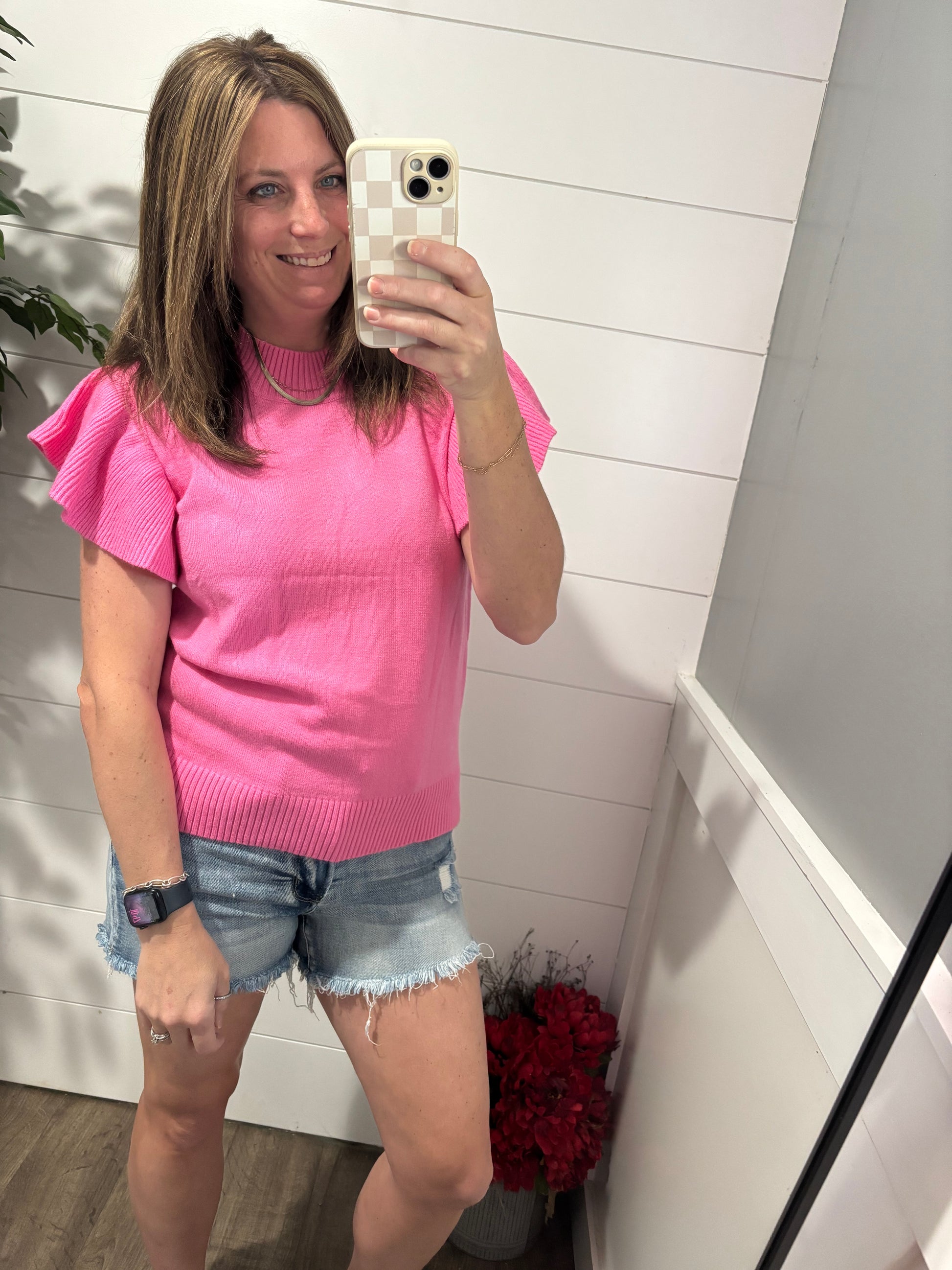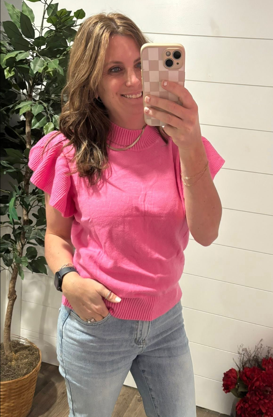 This lightweight knit sweater is the perfect pop of color your everyday wardrobe needs. Designed with soft ribbed texture and feminine flutter sleeves, it gives you that put-together look without even trying.