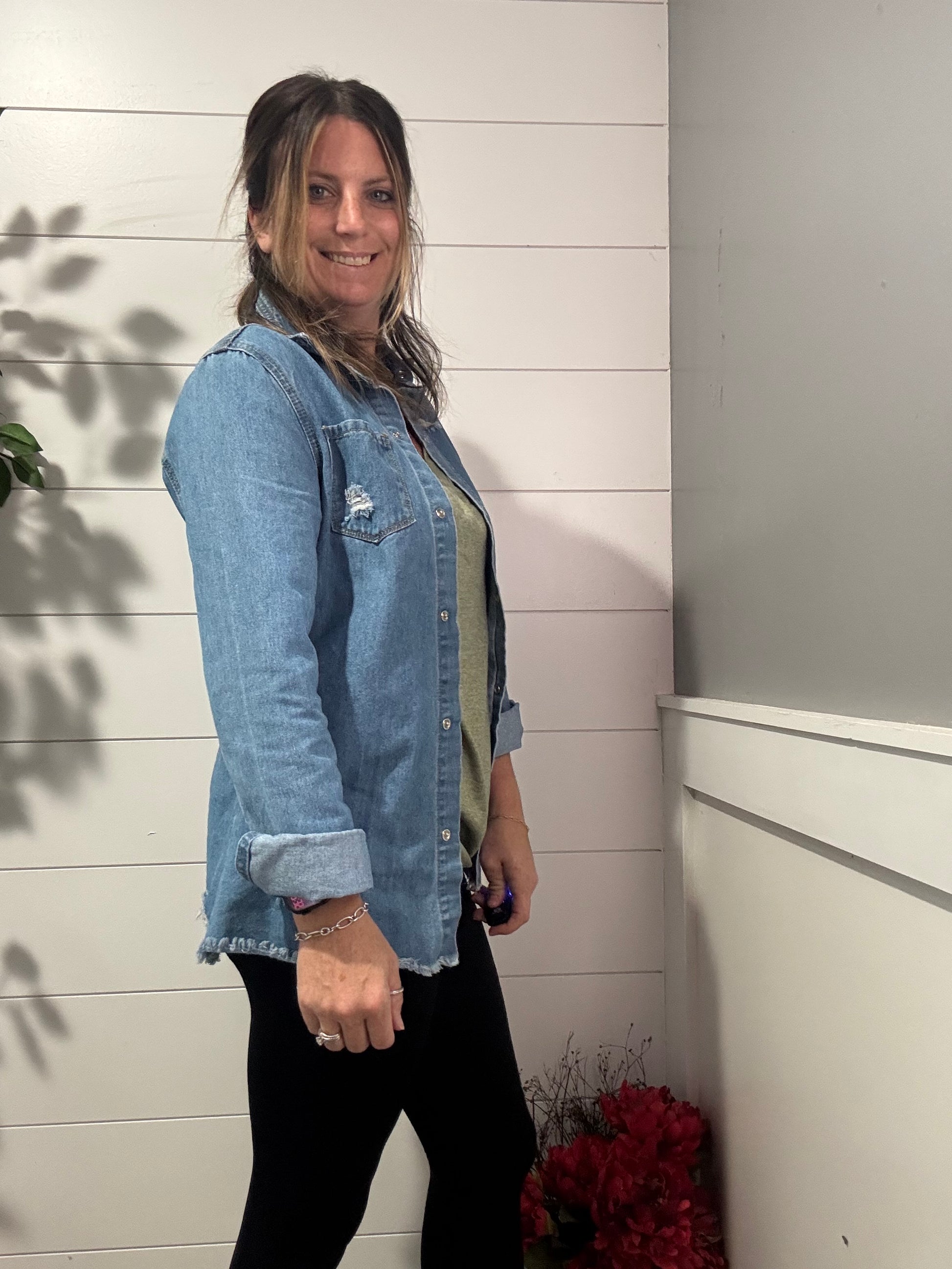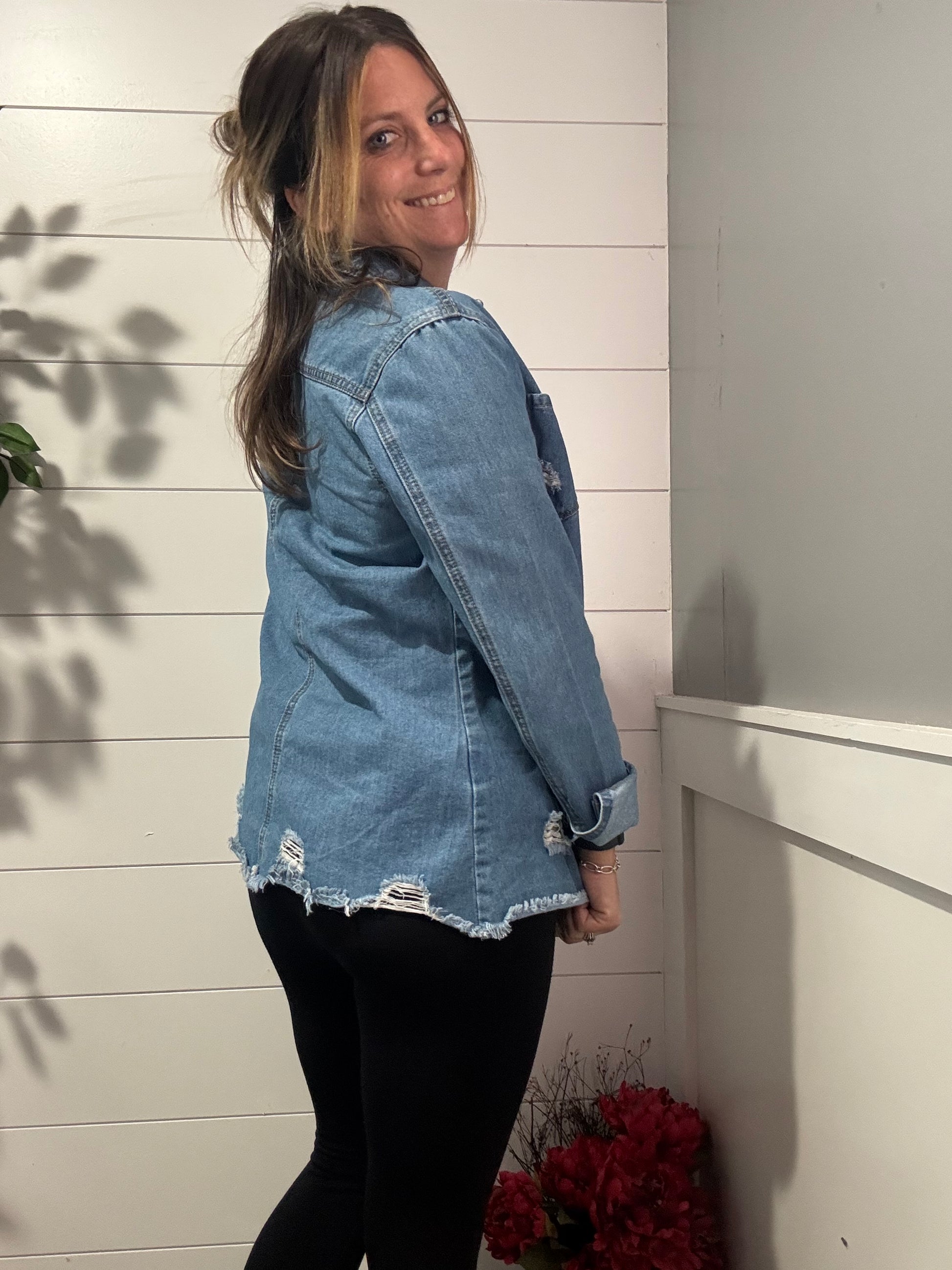This distressed denim jacket gives the illusion of layering without the extra bulkiness. With a gorgeous light wash and just enough distressing to give it a lived in feel, it has a button closure with pockets and an oversized hood. Snap button closure.