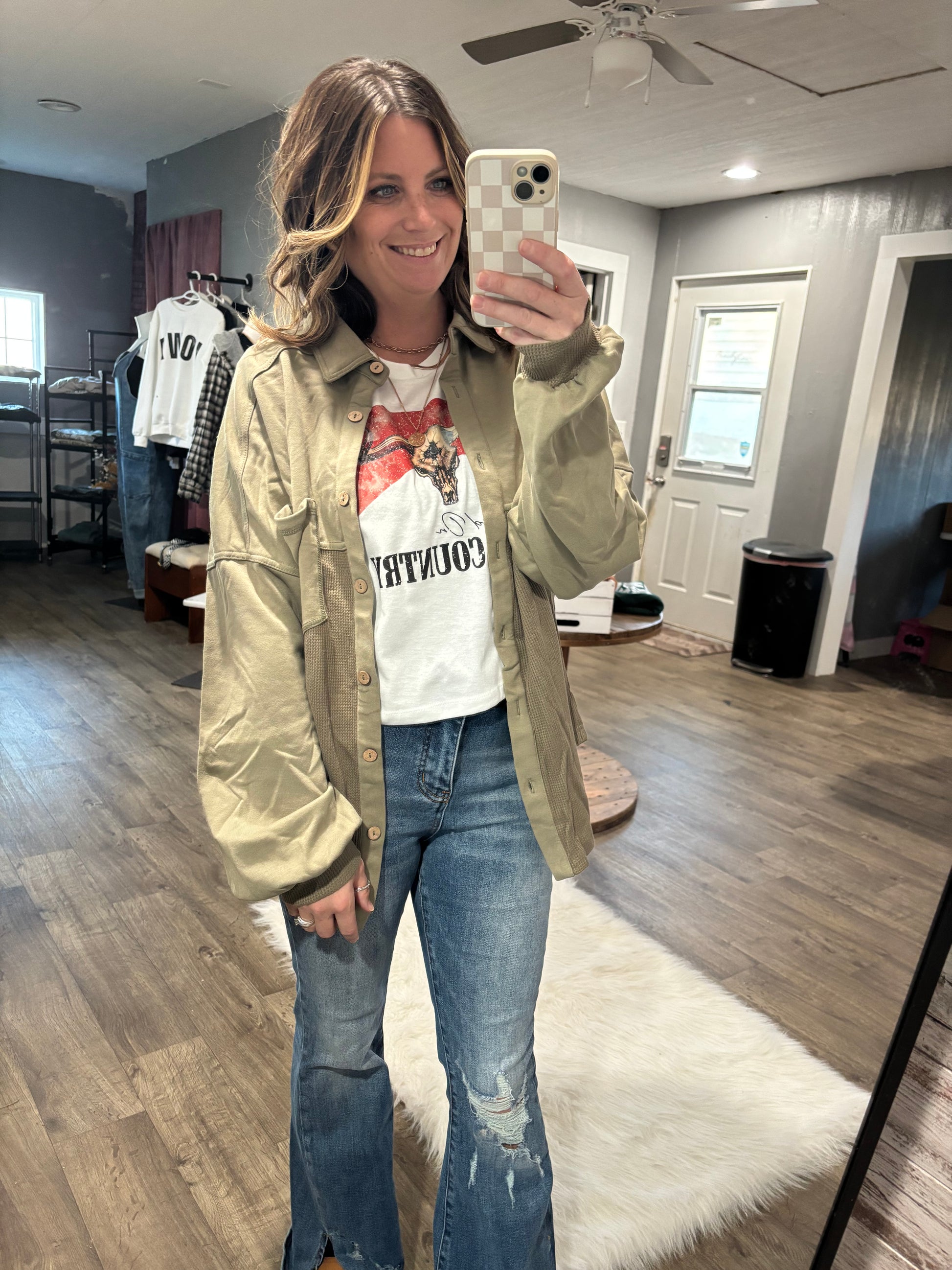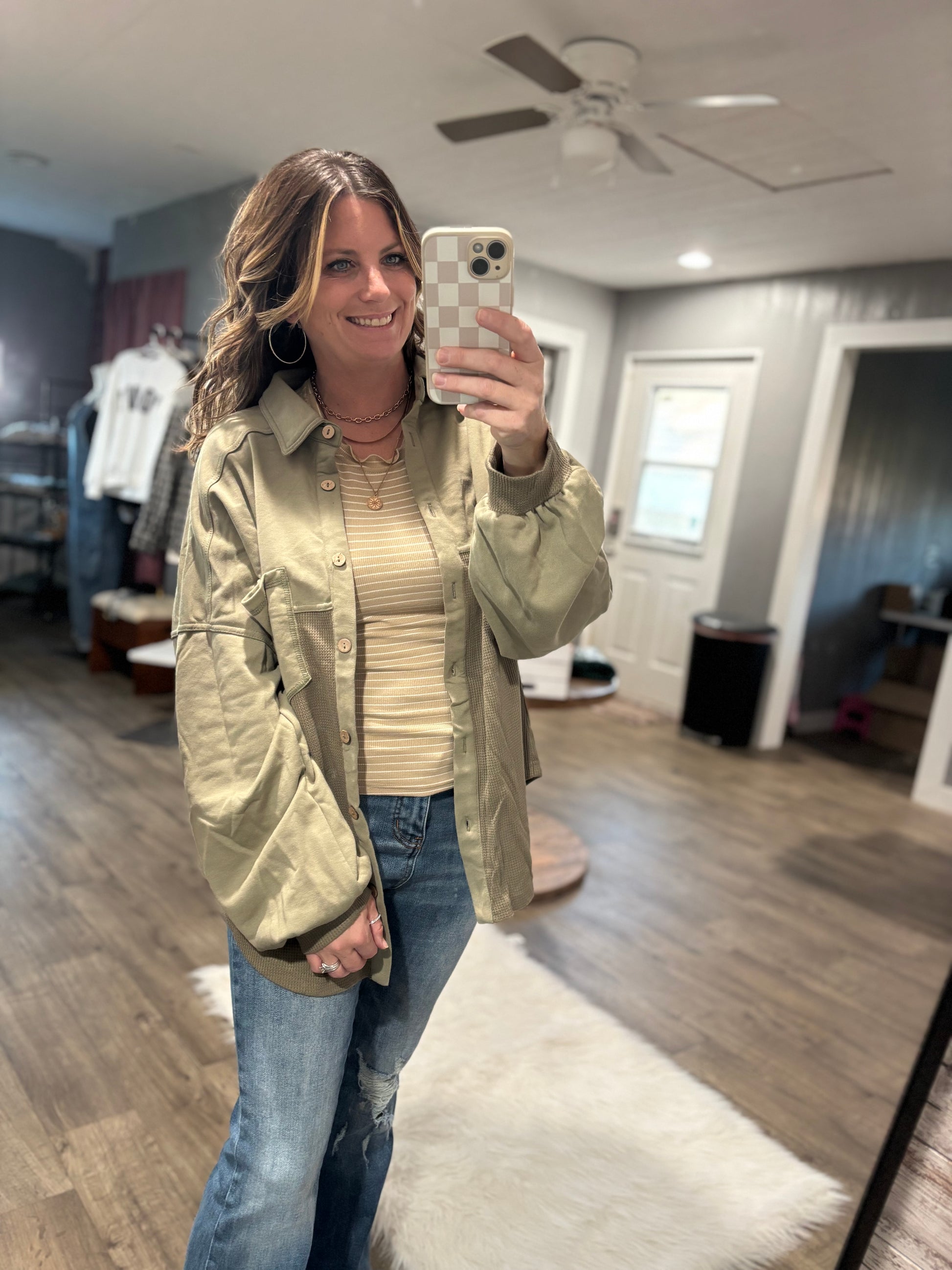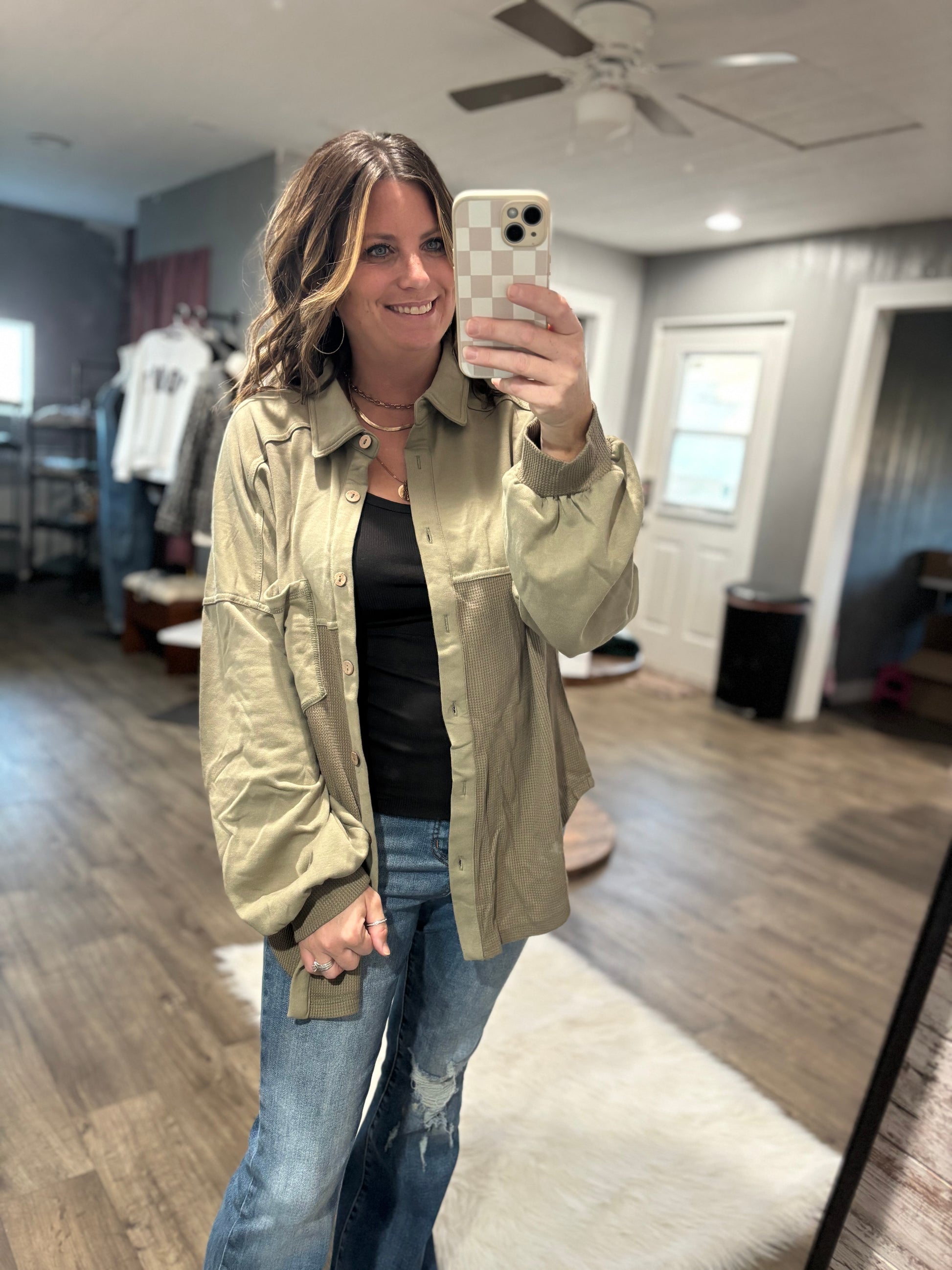 Meet your new go-to layer for cool days and cozy vibes. Our Kayla Patchwork Olive Shacket combines the softness of your favorite sweatshirt with the structure of a jacket. Designed with a textured waffle knit, button-up front, and relaxed fit — it’s the perfect throw-on piece for errands, coffee runs, or crisp fall strolls.