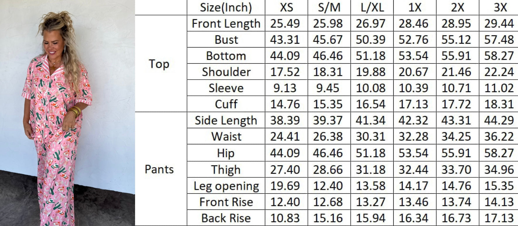 Our Luxe PJ Lounge sets are the perfect sleep set for both comfort and style. Features a button-up top with short sleeves and matching PANTS, with cute new designs that will keep you looking good while you relax. The fabric is ultra-soft, STRETCHY and lightweight for a relaxed feel. Pants have pockets and elastic waist. Feature contrast fabric on trim and collar for an extra "luxe" feel.MODEL:
