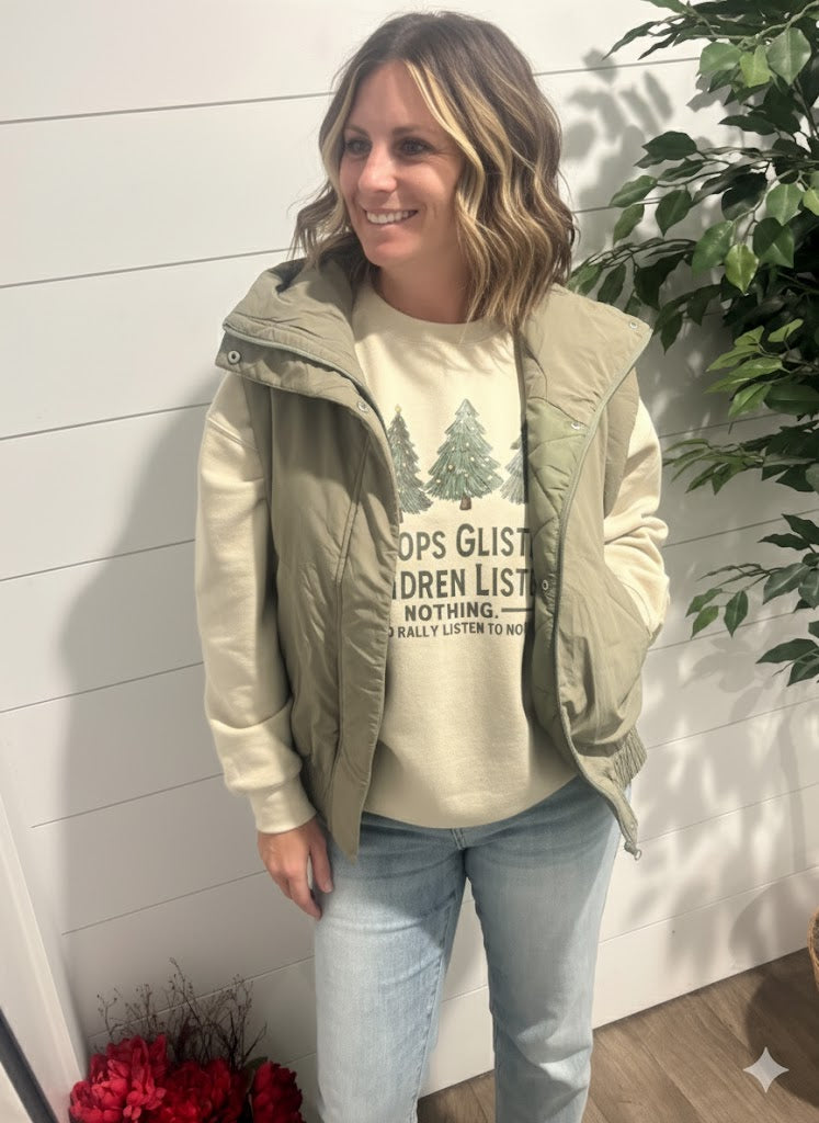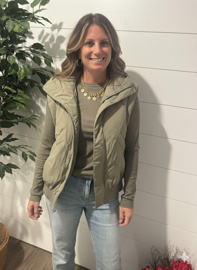 This lightweight vest features a structured silhouette with subtle quilting and a mock neckline for a modern edge. Designed with wide armholes, it layers effortlessly over any outfit without adding bulk. Includes a zipper closure and snap buttons for added functionality while maintaining its clean, minimal look. A closet staple for transitional weather and easy layering.