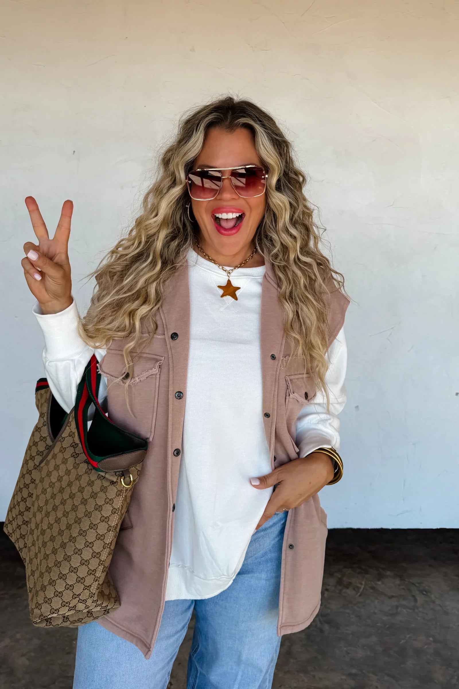 An easy, everyday layer with a relaxed fit and timeless utility style. The Hudson Utility Vest features a soft washed terry fabric, snap-button front with raw hem details, and functional front pockets. Designed in a neutral tone that pairs effortlessly with tees, sweaters, and denim for a laid-back, go-anywhere look.