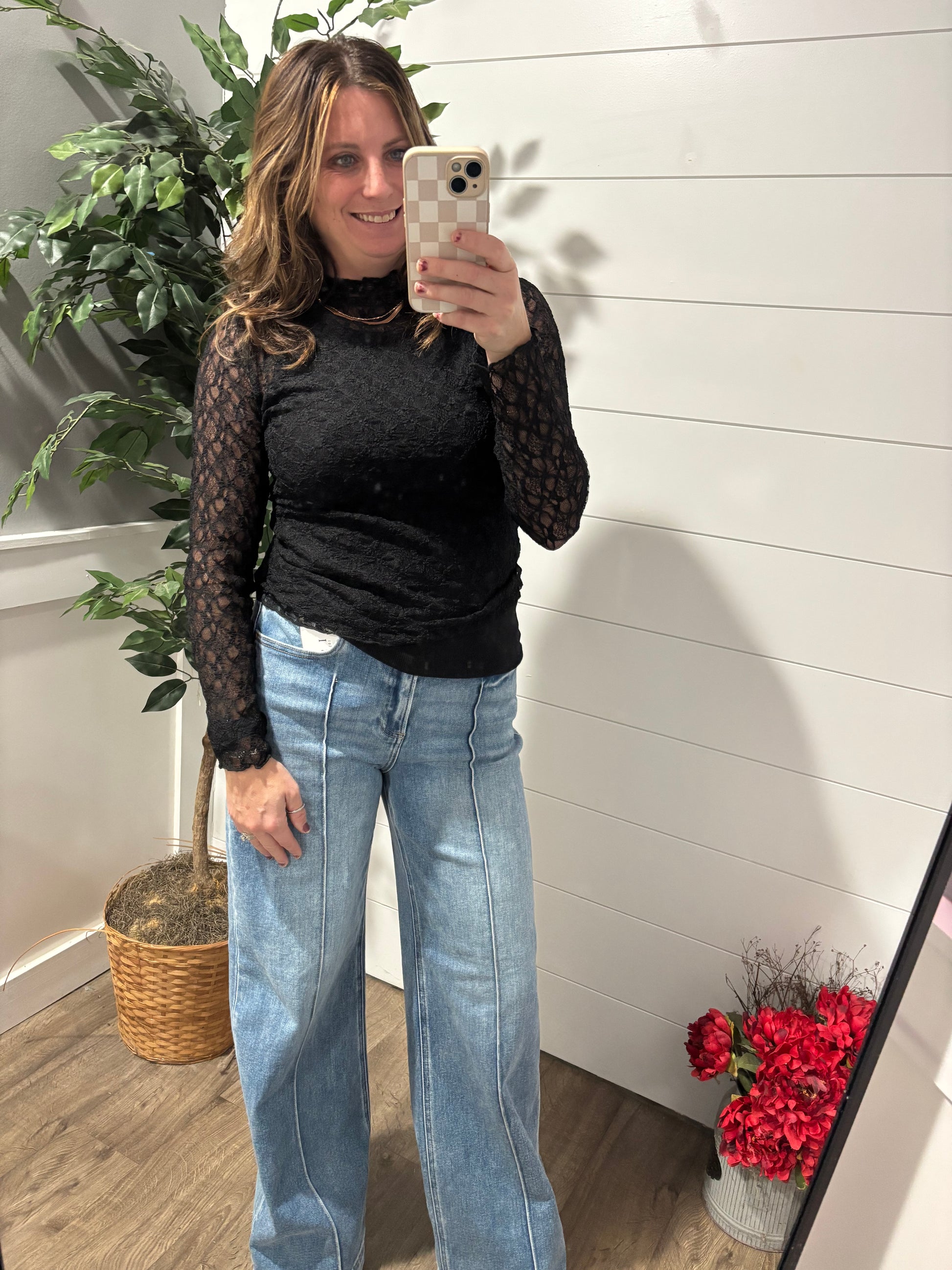 Our new lace tops are HERE!! Super cute for layering or wearing alone! SUPER soft, stretchy top features a totally sheer design. Perfect worn alone or paired under your favorite Lola cardigan, vest or sweater! Slight mock neck with lettuce trim and thumbhole detail sleeves.