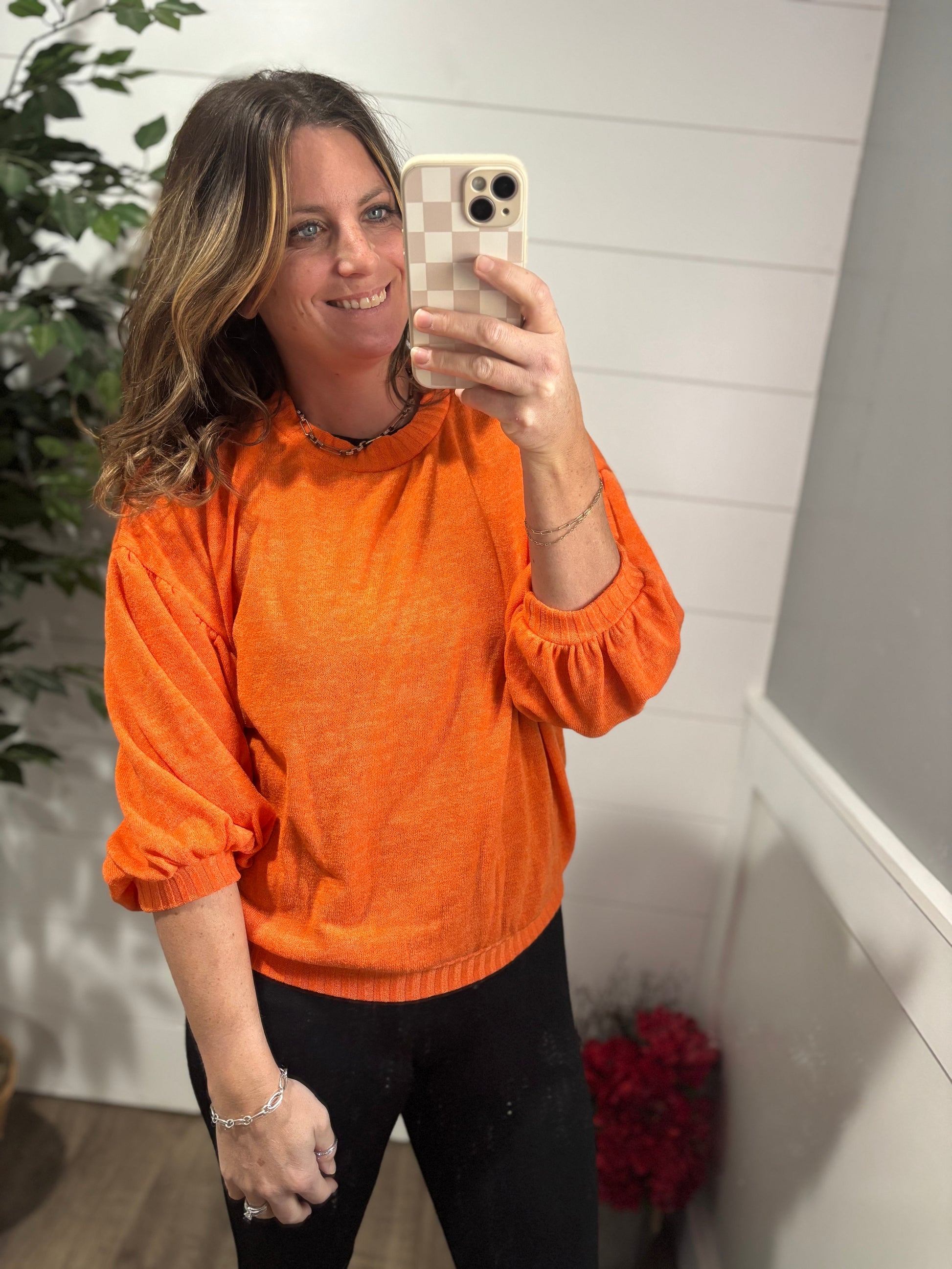 Introducing our Subway Station Sweater! This vibrant, cozy sweater is knit from ultra-soft yarn for maximum comfort. The 3/4 length balloon sleeves give you the perfect amount of coverage while the dropped shoulder and brilliant orange color are sure to make a statement. Warm up your wardrobe today!